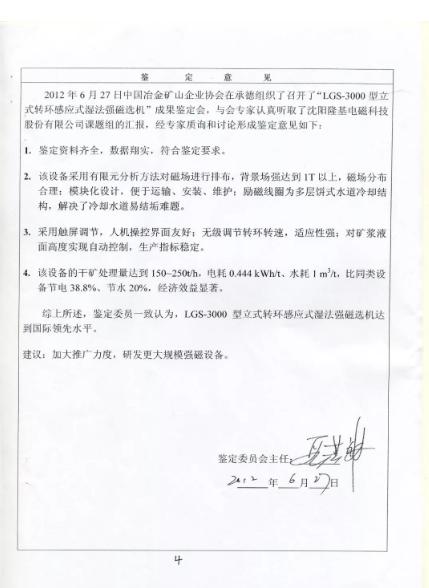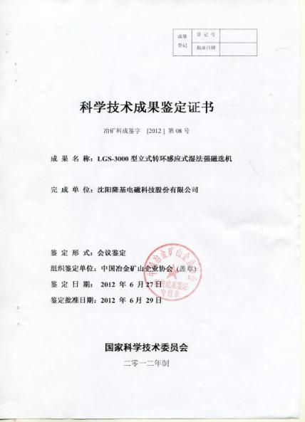 经国家技术科学委员会认定,隆基LGS系列立式转环感应式湿法强磁选机达到国际领先水平,在强磁选机的技术进步上具有重要意义。