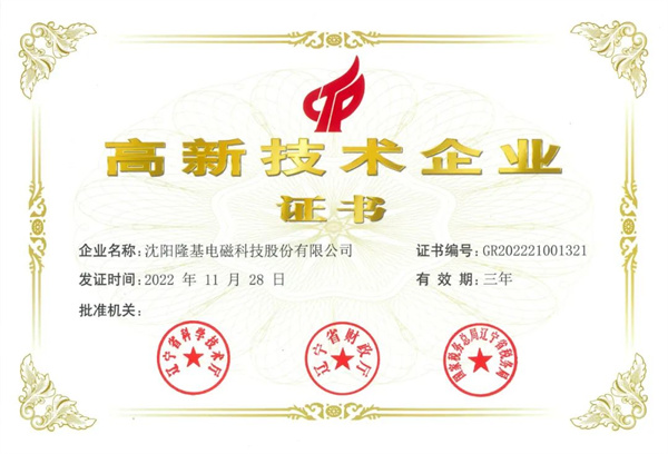 近日,隆基电磁再次获得由辽宁省科学技术厅、辽宁省财政厅和国家税务总局辽宁省税务局联合颁发的高新技术企业证书。
