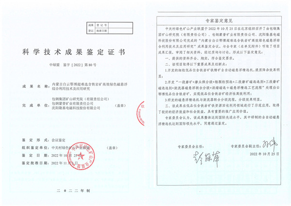 由赢博·(中国)集团-官网、包钢集团矿山研究院(有限责任公司)、包钢蒙普矿业有限责任公司共同完成的“内蒙古白云鄂博超难选含铁岩矿高效绿色磁悬浮综合利用技术及应用研究”通过“中绿盟”组织的科学技术成果鉴定,被认定为国际先进水平。