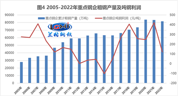其二,从吨钢利润数据来看,2022年整体钢铁行业吨钢利润呈现快速下降的态势,全年的吨钢利润仅在五十元左右(详见图3),而重点钢企的的吨钢利润可以达到百元左右(详见图4),这表明在钢材市场大幅波动的环境中,大中型钢铁生产企业的抗风险能力明显增强,同时也表明了这几年钢企针对下游需求变化而进行的产品结构调整正在发挥着有效作用。