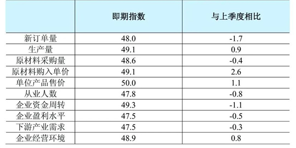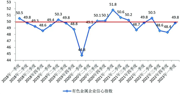 2023年一季度有色金属企业信心指数为49.8,比上季度上升1.4个点。信心指数在连续回落两个季度后再次出现回升,接近临界点50。另外,本期即期指数为48.6,较上期上升0.1个点;预期指数为50.6,较上期上升2.4个点,具体情况详见图1和图2。